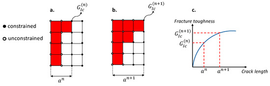 During delamination evolution, fibre-reinforced composite materials can show crack bridging, such as fibres crossing the open crack. Such a phenomenon, namely fibre bridging, increases the fracture toughness of the material as the crack length grows (see Figure 2) and, consequently, it is able to delay the delamination evolution. In [13], the SMXB procedure has been improved by implementing a modulus that is able to mimic the fibre bridging phenomenon by considering the GIc variations induced by fibre bridging (R-Curve, Figure 2c). Essentially, the GIc value changes as the constraints between nodes, representing the delaminated area, are released, as shown in Figure 2. Therefore, the fracture toughness grows according to the R-curve until a steady state value, which is representative of the maximum extension of the fibre bridging, is reached.
