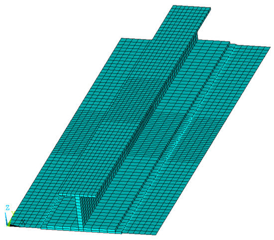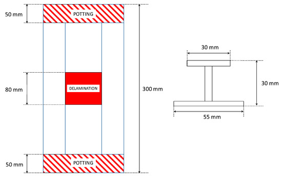 An I-stiffened reinforced composite panel, with induced delamination between the panel and the stringer, has been considered in this work. The geometrical description is shown in Figure 4. Twenty solid layered node elements have been considered to discretize the reinforcement and the skin underneath, while linear layered structural shell elements have been used to mesh the remaining skin panel, as shown in Figure 5, in order to reduce the computational cost [25]. The model consists of 2730 solid elements and 840 shell elements. The overall number of nodes is 22,837.