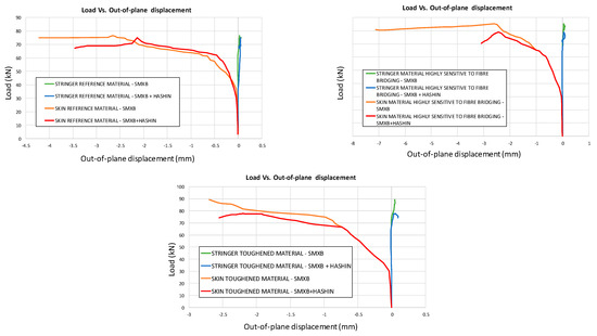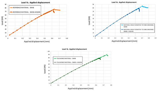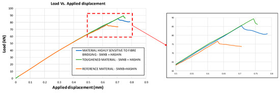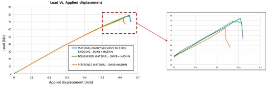 The global compressive behaviour of the analysed configurations, considering only the inter-laminar damage evolution, is reported in Figure 7, where the load versus applied displacement curves are compared for the three different analysed materials. It has been found that the delamination onset is influenced by the material’s characteristics. Indeed, in the reference material model, the maximum attained load is 76.6 kN as compared to the 85.4 kN of the material that is highly sensitive to the fibre bridging phenomenon. On the other hand, the toughened material model reaches a maximum load of 90 kN.