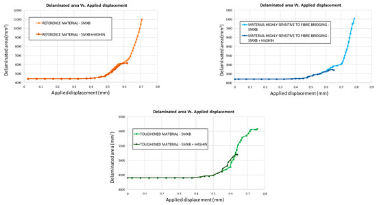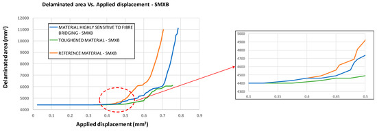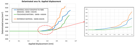 Figure 19 shows the delaminated area versus the applied displacements for the three considered configurations. It is clear from the chart that an increase in Mode I toughness reduces the delaminated area even in the presence of intra-laminar damage. Indeed, as an example, considering the fixed applied displacement value of 0.55 mm, the delaminated area can be reduced by up to 16.5% by increasing the Mode I fracture toughness.
