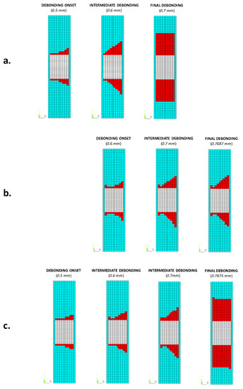 The debonding evolution trends, at different applied compressive displacement values, are shown in Figure 9 for each analysed configuration. According to the figure, the debonding fronts grow with an inclination of about 45° with respect to the loading direction.