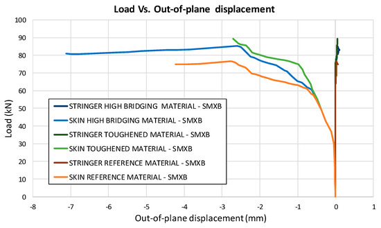 In Figure 10, the load versus the out-of-plane displacement curves, representative of the buckling behaviour of the panels, are shown for each analysed configuration. Local buckling of the delaminated region can be appreciated at 30 kN. The delamination growth initiation load values, together with the buckling loads, are listed for each analysed configuration in Table 2. The delamination growth initiation load for the reference material is the same as that for the material with high sensitivity to fibre bridging. Indeed, for these two materials, the value of the critical energy release rate at the beginning of delamination growth is the same.