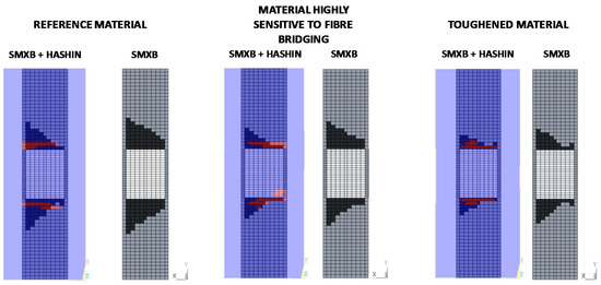 The three different panel configurations (characterised by different material systems) have been further analysed by considering both the inter-laminar and the intra-laminar damage evolution. The influence of the fibre/matrix breakage on the delamination evolution can be observed in Figure 11, where the delaminated areas found with the SMXB procedure are compared with the delaminated areas found by using SMXB coupled with the Hashin’s criteria, for all the considered material models.
