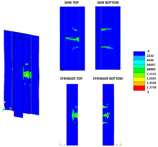The intra-laminar damage status, for the three analysed configurations, at the final states, are shown in Figure 16, Figure 17 and Figure 18. Contour values over unity indicate a damaged region, while zero indicates an undamaged region (0, undamaged; 1, damaged; 2, completely damaged).
