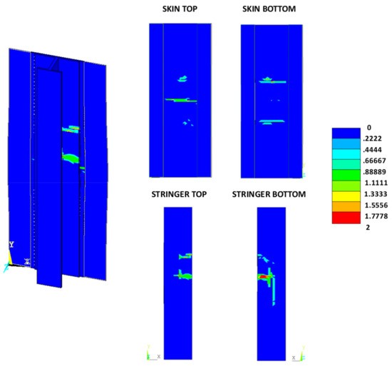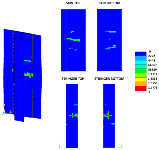 In order to accurately predict the collapse of a composite structure, in-depth knowledge of the interaction between inter-laminar and intra-laminar failure mechanisms is mandatory. Indeed, matrix and fibre cracks affect delamination initiation and evolution [17,18]. Moreover, intra-laminar cracks operate as delamination migration paths among adjacent plies or as boundaries that limit delamination evolution [19,20]. In [21], the SMXB procedure has been coupled to a User Material Subroutine [22] for the modelling of intra-laminar damages by means of instantaneous degradation of the material properties based on the Hashin’s failure criteria. A single stiffened CFRP panel was studied, and comparisons were made between numerical results and experimental data.