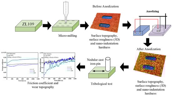 In the present paper, the impact of surface roughness on the friction property of eutectic aluminum-silicon alloys was investigated under dry and oil-lubricated conditions. The framework structure of this study is illustrated in Figure 1. The micro-milling process depended on forced material removal and was utilized to manufacture micro-textures on specimens. Then, the textured specimen was subjected to anodizing to fabricate alumina films. The phase composition and microstructure of the aluminum oxide films were investigated by X-ray diffractometer (XRD), scanning electron microscope (SEM), and energy dispersive spectroscopy (EDS) analyses. This sequential process is easy to implement with a high efficiency and low cost. Confocal laser scanning microscopy (CLSM) and SEM were employed to characterize the surface topography before and after anodizing. Nano-indentation tests were performed to measure the superficial hardness of alumina films. Frictional coefficients of testing specimens were reported to investigate the effect of surface roughness on frictional properties under dry friction and oil-lubricated conditions.
