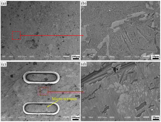 The surface morphologies of F, M, and AM specimens are characterized by SEM in Figure 2. Figure 2a,b depicts the surface morphology of flat specimens. Figure 2c,d illustrates the SEM topography of micro-textured specimens. Before anodizing, the length, width, and distance of rectangle dimples are 600, 200, and 500 µm. The depth is 45 µm, and the dimple area density is 22.2%. The surface micrograph of micro-textured specimens treated with anodizing is illustrated in Figure 2e,f. The anodized surface becomes rougher than the micro-textured one. Porous aluminum oxide films have been fabricated on the surface of ZL109 by anodizing. The phosphoric acid anodic film surface appears to be relatively uniform. The pores are of irregular shapes, and the array is regular [36].