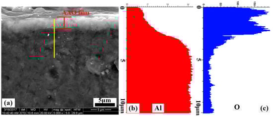 The cross-sectional SEM micrograph of anodized ZL109 is illustrated in Figure 3a. Alumina films are distributed evenly on ZL109 alloys with the thickness of 3 μm. The distribution of the aluminum oxide films’ elements is checked by EDS line scanning, and the results are presented in Figure 3b,c. As can be seen, the Al and O elements obviously diffuse on the ZL109. The aluminum and oxygen directly result from the growth of the anodic film.