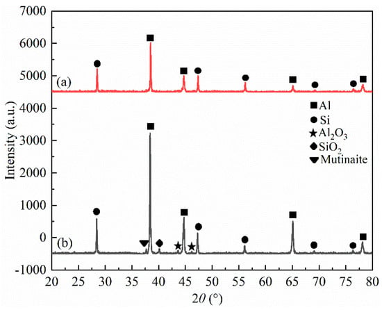 The XRD patterns of ZL109 before and after anodizing performed on the surface are shown in Figure 4. The XRD pattern of ZL109 before anodizing shows that peaks of Al and Si arise from ZL109 alloy matrix of the composites (Figure 4a). Figure 4b shows that the main phase constituent of the aluminum oxide films is Al and Si. Al and Si come from ZL109 alloy substrate. The aluminum oxide films consist of mutinaite (Al2O3·54SiO2), Al2O3, and SiO2 phase, which formed mainly in the reaction process of anodization.