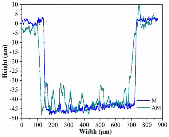 Two-dimensional cross-sectional views of a single micro-texture along the long side are demonstrated in Figure 5. The length, width, and depth of micro-textures before and after anodizing are almost the same. Surface topography of micro-textures is changed through anodizing. The bottom topography of micro-textures after anodizing becomes rough compared with that of micro-textures before anodizing.