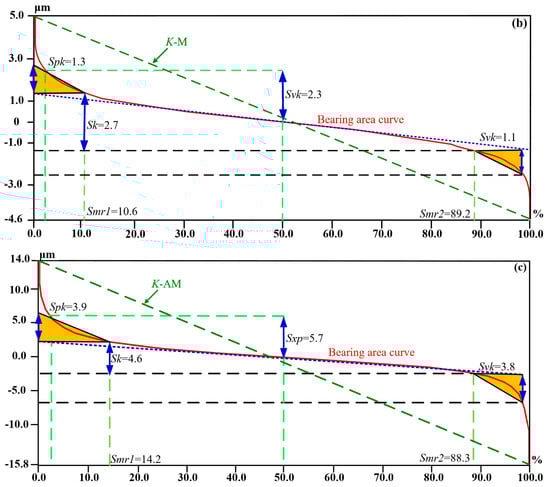 Bearing area ratio curves of a random rough surface are S-shaped, as illustrated in Figure 6. The reduced peak height Spk is the average height of the protrusion above the roughness core profile, which indicates the area that quickly wears out by relative motion. The reduced valley depth Svk is the average depth of the profile valleys projecting through the roughness core profile, which demonstrates the sub-surface that retains oil for lubrication. The core roughness depth Sk is the roughness profile excluding the fine protruding peaks and deep steep-sided valleys, which is the core depth of the functional surface during the lifetime of the surface. The material component Smr1 is the percentage of the material ratio curve that coincides with the upper limit of the roughness core profile Sk. The material component Smr2 is the percentage of the material ratio curve that coincides with the lower limit of the roughness core profile Sk. The pole height Sxp generally represents the height difference between the material ratio of 2.5% and the material ratio of 50%. The parameters Spk and Svk are each calculated as the height of the right-angle triangle, which is constructed to have the same area as the “peak area” or “valley area”, respectively. The right-angle triangle corresponding to the “peak area Area1” has Smr1 as its base, and that corresponding to the “valley area Area2” has Smr2 as its base.