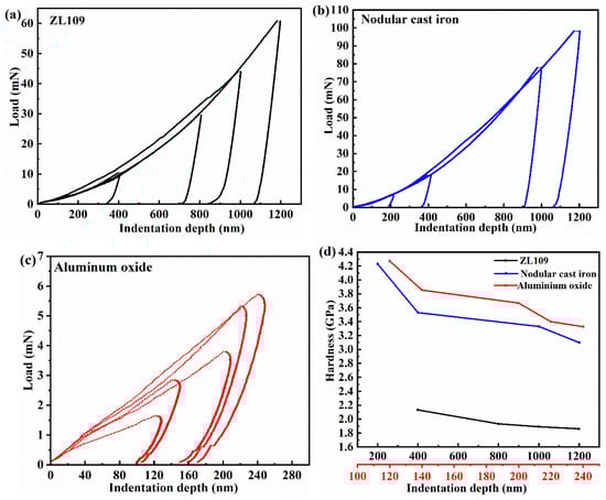 The load-unload curve and superficial hardness over different indentation depths for ZL109, nodular cast iron, and aluminum oxide (black, blue, and red lines) are depicted in Figure 7. The phenomenon that the nanoindentation hardness decreases with the increasing maximum displacement is called size effect. The hardness of aluminum oxide increases by anodizing compared with that of ZL109, which is higher than that of nodular cast iron.