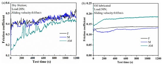 Figure 8 shows the plot of frictional coefficients varying with running time of 1200 s to elucidate the frictional property of F, M, and AM specimens under dry and oil-lubricated conditions. For sliding friction, both adhesion and ploughing components govern friction under dry sliding, while lubricated sliding can be characterized only by the ploughing component [30,37]. It is obvious that surface roughness controls friction process, since it fundamentally influences friction behavior.