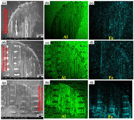 SEM micrographs of flat, micro-textured, and anodizing micro-textured specimens (a,d,g) and EDS element mapping data of (b,e,h) Al, (c,f,i) Fe.