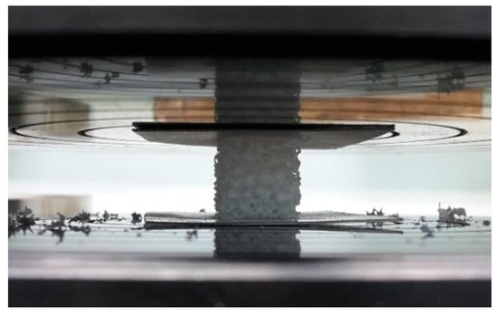 The compressive strength of the pyrolyzed and crosslinked samples, which were prepared with PU-templates with the dimensions of 15 mm × 15 mm × 20 mm, was determined using a TIRAtest 2825 testing machine with circular loading plates (diameter: 150 mm) (TIRA GmbH, Schalkau, Germany). To ensure a more homogenous load on the samples a cardboard piece with 1 mm thickness was placed between the loading plates and the sample because of sticking out struts. The applied head moving speed was set to 2 mm min−1. Ten samples of every foam series were measured, whereby the samples were put on the plane site. The measurement settings were selected according to the test configurations chosen in References [,]. A photo of the setup and a tested specimen is shown in Figure 1.