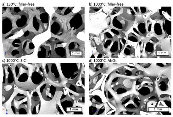 X-ray µ-CT reconstruction image of a volume element representing the typical structure of (a) a crosslinked filler-free foam and (b) of a filler-free foam pyrolyzed at 1000 °C. Foams pyrolyzed at 1000 °C with fillers are shown in (c) with SiC as filler and in (d) with Al2O3 as filler. The white bars indicate the length scale of 1 mm.