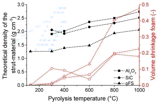 Dependence of the theoretical density of the strut material measured on crushed filler-loaded (Al2O3, SiC) and filler-free foams (oFS) and volumetric shrinkage of the temperature treated foams in dependence of the pyrolysis temperature.