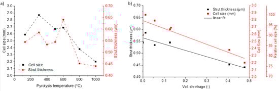 (a) Maxima of the strut thickness and the cell size distribution in the pyrolyzed foams in dependence of the pyrolysis temperature; (b) Strut thickness and cell size and relative cell size as function of the volume shrinkage of foams.