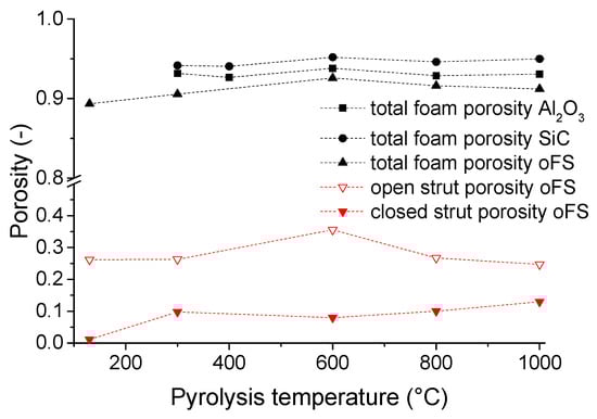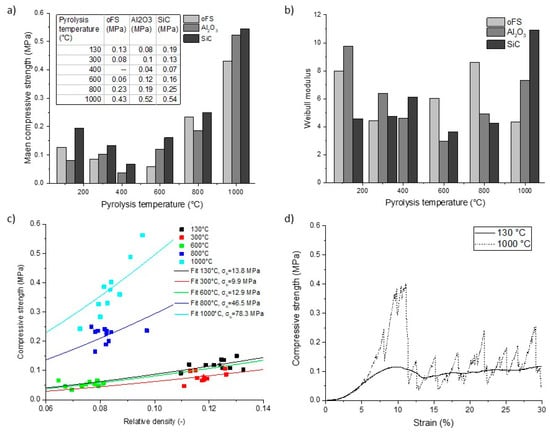 The results are shown in Figure 11a. The characteristic compressive strength decreases up to a pyrolysis temperature of 400 °C and increases with rising pyrolysis temperatures. The compressive strength correlates with the total porosity of the foams. The higher the porosity, the lower is the compressive strength (see Figure 11a). The samples with SiC as filler material have higher compressive strength values in comparison to the Al2O3 filled foams. The Weibull moduli (Figure 11b) show a similar trend; with increasing compressive strength, the Weibull moduli increase. The values range between 3 and 11, lying in the range of as reported replica ceramic foams [,,].