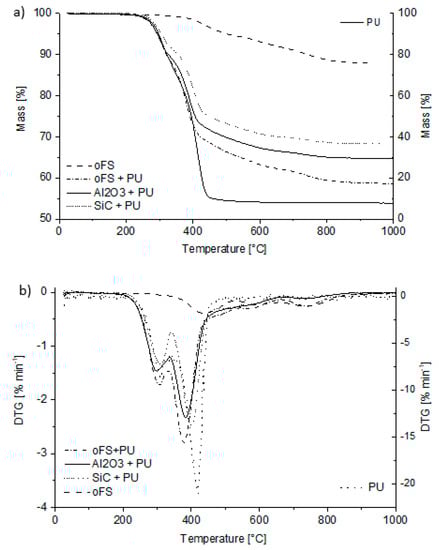(a) Thermogravimetric analysis of the preceramic coating material without fillers (oFS), of the polyurethane foam template (PU) and of the crosslinked coated foams with (Al2O3 + PU, SiC + PU) and without fillers (oFS + PU) including the polyurethane template; (b) Differential thermogravimetric (DTG)-signal of the thermogravimetric signals.