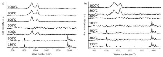 Parallel to the increase in density, the preceramic polymers showed specific mass losses during heating. These transformation reactions were studied by thermal gravimetric analysis (TGA) and Raman microscopy. The results of the thermogravimetric analysis are shown in Figure 6. The crosslinked coating materials with and without filler show different steps in mass loss. These steps can be correlated to specific reactions that occur during the pyrolytic polymer-to-ceramic transformation in inert gas of crosslinked poly-organosiloxanes with methyl-, ethyl-, phenyl- or ethoxy-side groups. According to the literature these reactions are listed below [,,,,,,,,,,]: