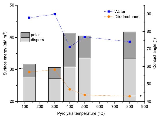 3.2.3. Wetting Behavior as a Function of Pyrolysis Temperature