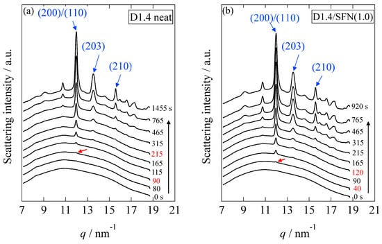 Time-resolved wide-angle X-ray scattering (WAXS) profiles of (a) D1.4 neat (b) D1.4/SFN(1.0) specimens. The red arrow indicates the first detection of the peak.