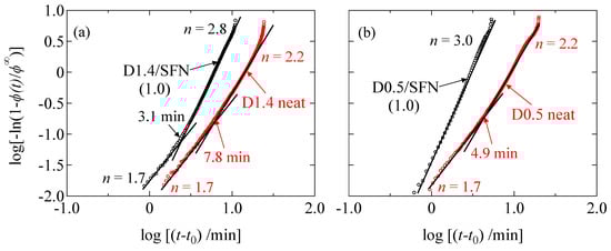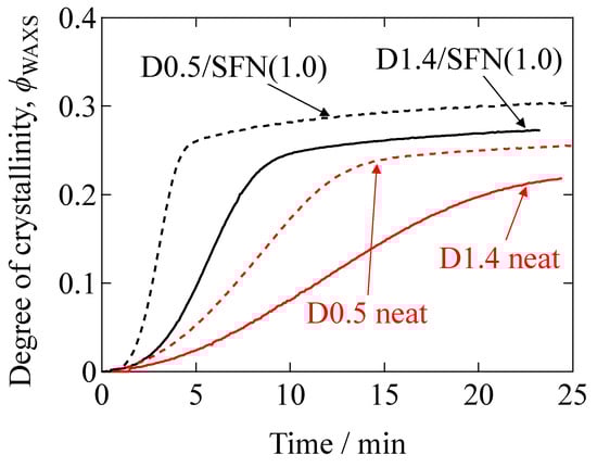 Here, ϕ∞ denotes the degree of crystallinity after the complete crystallization, t0 is the induction period for the crystallization, n is the Avrami exponent which represents the dimensionality of the growing crystallites and k is the crystallization rate constant, which contains the contributions from the nucleation and the growth of crystal. The Avrami plots for the D1.4 neat, D1.4/SFN(1.0), D0.5 neat and D0.5/SFN(1.0) specimens are shown in Figure 7. Here, the initial slope of the Avrami plots was different from that in the later stage, suggesting the change in the mode of the crystal growth. The crossover time is earlier for the D0.5 neat specimen than the D1.4 neat specimen. However, in the case of the D0.5/SFN(1.0) specimen, such crossover behavior was not observed. The similar tendency of the Avrami plots has been found in our previous study [] in which the Avrami plots are made on the basis of the results of the DSC measurements. In the early stage of the crystallization, the Avrami exponent (n) for the D1.4 neat specimen and for the D0.5 neat specimen was n = 1.7 for both, suggesting the one-dimensional crystal growth because of the homogenous nucleation for the D1.4 neat and the D1.4/SFN(1.0) specimens in the early stage of the crystallization (t < 3.9 min or t < 14 min), respectively, for those specimens as reported in our previous paper []. However, in the later stage of the crystallization, the Avrami exponent (n) was increased from 2.2 (D1.4 neat) to 2.8 (D1.4/SFN(1.0)) by the loading of SFN, which suggests the change of the dimensionality of the crystal growth from 2 dimensional to 3-dimensional by SFN because of the heterogenous nucleation. Such a crossover is also confirmed in the D0.5 neat specimen. If we compare the later stage of the crystallization for the D0.5 neat and D0.5/SFN(1.0) specimens, the Avrami exponent (n) is also increased from n = 2.2 to 3.0. Such a change of the dimensionality of the crystal growth was observed for the Avrami plots based on the DSC results in our previous study [] with almost similar values of the Avrami exponent (n). These results suggest that the SFN increases the dimensionality of the crystal growth, and hence the crystallization rate (crystallinity increasing rate) is accelerated.