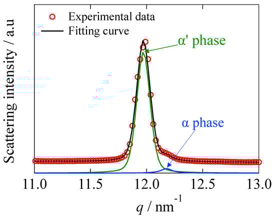 Furthermore, it is important to check the effect of SFN on the formation of the crystal polymorph (α and α’ phases). For this purpose, the evaluation of the fraction of α and α’ phases formed during the isothermal crystallization at 110 °C was conducted by analyzing the (200)/(110) reflection. Since there observed a small shoulder around q = 12.2 nm−1, we tried to decompose the shoulder peak (α phase) from the main peak (α’ phase). Figure 3 shows an example of the peak decomposition in the range of 11 < q < 13 nm−1, ensuring the perfect peak decomposition.