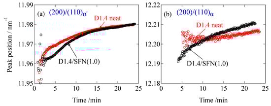 Figure 4 shows the changes in the peak positions of the α’ and α phases. The peak positions of both of the phases are continuously increasing as the crystallization process proceeds. These results show that loosely packed crystals are initially formed and gradually densified as a function of time. There was almost no effect of SFN on the overall behaviors of the changes in the peak position.