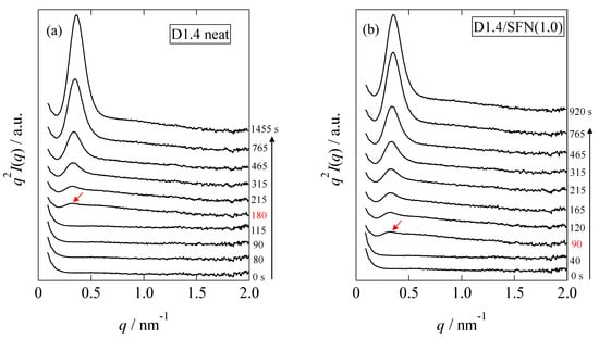 Changes in the Lorentz-corrected SAXS profiles as a function of time for (a) D1.4 neat and (b) D1.4/SFN(1.0) specimens during the isothermal crystallization at 110 °C from melt. The red arrow indicates the first detection of the peak.