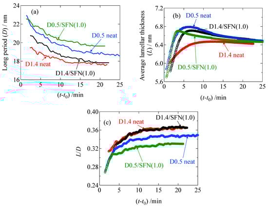 It should be noted here that the average lamellar thickness (L) did not monotonically increase as a function of time, as the increasing tendency turns over around 7 min for the D0.5 neat specimen or 4 min for the D0.5/SFN(1.0) specimen. The reason why L decreased a bit before reaching a constant value may be explained by the formation of new lamellae []. It may be explained that in prior to 7 min for the D0.5 specimen or 4 min for the D0.5/SFN(1.0) specimen, a new thin lamellae may be formed from the amorphous region. This argument has been recently reported by our group [] for the isothermal crystallization of the D0.5 specimen in the presence of a special plasticizer (OMG) at 100 °C from the melt, where a higher order peak was observed in the Lorentz-corrected SAXS profiles.