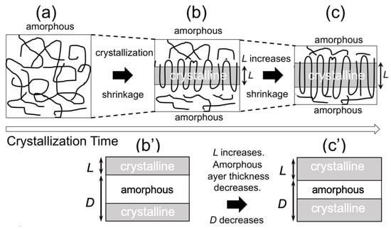 Here, γ(r) is the correlation function and r is the distance in the real space. Figure 9 shows thus-evaluated L and D and the ratio (L/D) as a function of time during the isothermal crystallization upon T-jump from 200 °C to 110 °C. As a result (Figure 9b), the average lamellar thickness increases with time, which is reasonable as a crystallization behavior. Therefore, the decreasing behavior of D is also reasonable, as schematically shown in Figure 10. Upon crystallization, shrinkage takes place. Since the lamella thickens with time, this results in the decrease of D (Figure 10b,c), as an amorphous layer thickness is decreased to a greater extent as compared to the increasing extent of L (lamellar thickness).