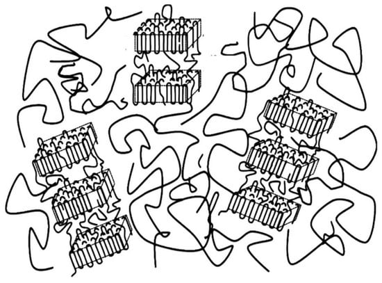Schematic illustration of the sparsely distributed lamellar stacks in the matrix of polymer melts. This illustrates an early stage of polymer crystallization (adapted from reference [] with a permission. The figure has been slightly modified).