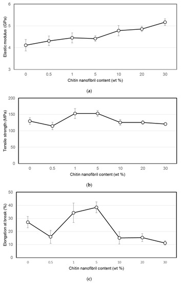The measurements of the mechanical properties of the films were carried out with the electrodynamic system ElectroPuls E1000 (Instron, Norwood, MA, USA) in the mode of stretching the sample in the form of strips 2 mm wide and 20 mm long. Tensile tests were carried out at a speed of 5 mm/min at room temperature. Prior to the mechanical testing, films were stored at a relative humidity (RH) of 66% for 24 h. Ten measurements were taken at each point.