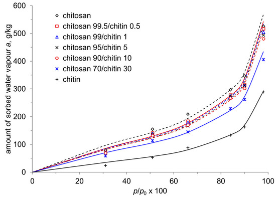 Water vapour sorption was measured by the isopiestic method; the RH in the desiccators was created with saturated salt solutions. The desiccators were thermostated at 25 °C. The samples were kept at each partial water vapour pressure until sorption equilibrium was established, where the equilibrium sorption values were established for 3–7 weeks. Before measurement, the samples were dried at 80 °C to a constant weight [