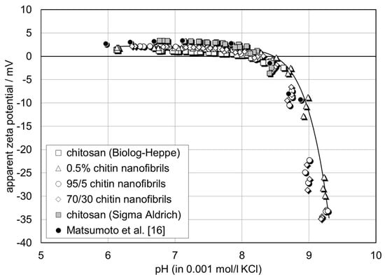 The surface charge of the chitin-chitosan nanocomposite films was assessed by the zeta potential at the film-water interface. The surface zeta potential was determined from the measurement of the streaming potential using the instrument SurPASS™ 3 (Anton Paar, Graz, Austria). The streaming potential was generated by applying a pressure gradient across a capillary channel, which provokes flow of an aqueous solution and is related to the surface zeta potential by