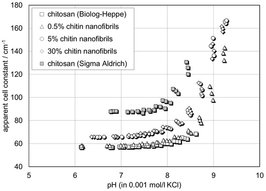 R inside the capillary channel was measured under stagnant (no-flow) conditions. The electric conductance, i.e., the inverse Ohm resistance, is an indicator for the swelling propensity of the chitin–chitosan nanocomposite films. To compensate for the effect of a variation in the electrolyte conductivity of the bulk solution, either due to a shift in the solution temperature or due to an increase in the ionic strength by the addition of 0.05 mol/l KOH, the cell constant of the capillary channel calculated according to