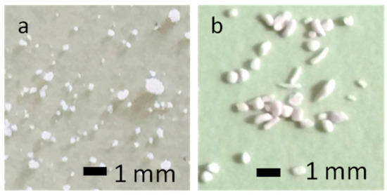 Figure 1 shows photographs of CM, as shown in Figure 1a, and Sf-TCP, as shown in Figure 1b, after sieving according to the catalog size of CM. The catalog CM size was 150–500 μm, but some particles of less than 150 µm were present.
