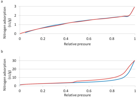 Adsorption-desorption isotherms. The blue line indicates adsorption, and the red line indicates desorption. (a) CM; (b) Sf-TCP.