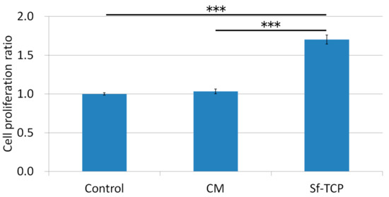 Effects of CM and Sf-TCP on cell proliferation. Values are the means ± standard errors (SEs) (n = 6). ***P < 0.001.