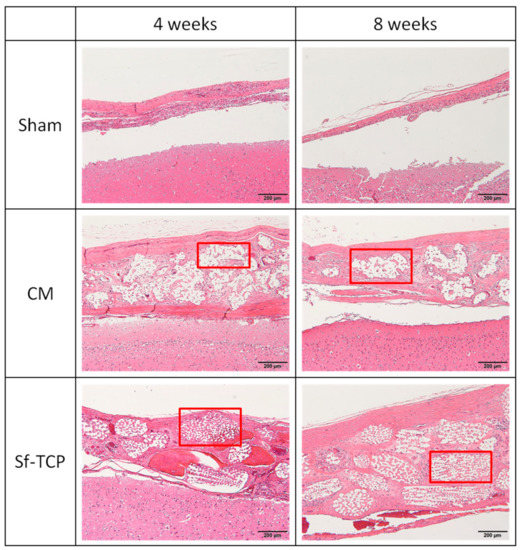 Figure 6 shows photographs of HE-stained specimens. In the sham group, there was a thin tissue layer covering the bone defect. In contrast, in the CM group, the amount of tissue present in CM was nearly unchanged from 4 to 8 weeks. In the Sf-TCP group, tissue was already present in the porous structure of Sf-TCP at 4 weeks.