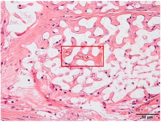 Figure 11 shows images of erythrocytes stained with Orange G inside the implant at the time of observation, and Table 2 shows the number of individuals exhibiting erythrocytes in the prosthetic material. These results were observed only in the Sf-TCP group (one of five animals at 4 weeks and three of six animals at 8 weeks).