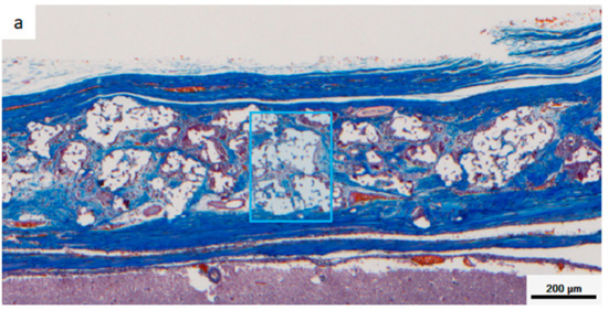 Masson’s trichrome (MT)-stained images taken with Vectra3. Aniline blue stains fibrous tissue blue, Masson liquid stains cells red, and Orange G stains blood cells orange. (a) CM implant at 4 weeks. (b) Sf-TCP implant at 4 weeks. The blue boxes indicate the area quantified in Figure 10.