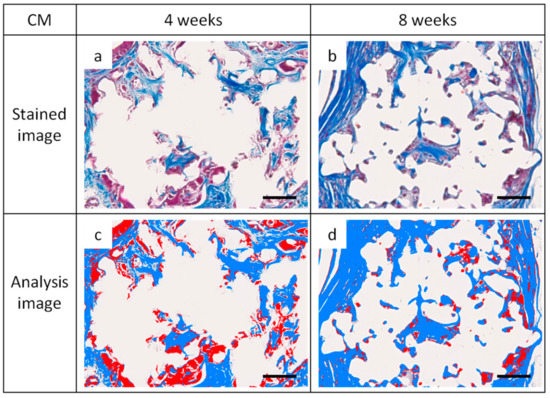 Figure 9 shows an enlarged image of the region selected in Figure 8 and an image obtained by analyzing the corresponding portion with inForm. Cells and fibrous substances existed mainly in the periphery of CM in the CM group at 4 and 8 weeks, whereas in the Sf-TCP group, cells and fibers entered into the pores of Sf-TCP.