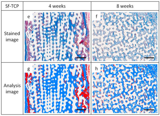 Images of Masson’s trichrome (MT)-stained sections and analysis images for quantification. Representative images showing cells and fibrous tissue existing mainly around CM or Sf-TCP pores. Cells appear more uniformly scattered at 8 weeks than at 4 weeks. (a,b) CM images with MT staining. (c,d) CM images for analysis. (e,f) Sf-TCP images with MT staining. (g,h) Sf-TCP images for analysis. Aniline blue staining (blue) shows fibrous tissue, and Masson liquid and Orange G staining (red) show cells. Scale bar: 50 μm.