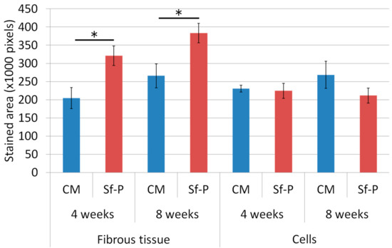 Figure 10 shows the results of quantifying areas of fibrous tissues and cells. Fiber and cell areas in the CM and Sf-TCP groups were compared at 4 and 8 weeks. The results showed that the fiber mass was significantly larger in the Sf-TCP group than in the CM group at both 4 and 8 weeks. However, actual cell amount did not change significantly.