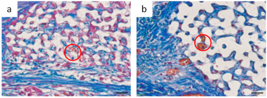 Image of erythrocytes observed inside Sf-TCP. (a) 4 weeks. (b) 8 weeks. Red circles indicate erythrocytes observed in Sf-TCP. Scale bar: 20 μm.