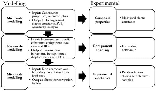 The workflow (Figure 1) follows a typical multiscale approach [31] where microscopic behaviour is described using a representative volume element (RVE) and global response is simulated using homogenisation of the RVE (first step). Statistical representation of the microstructure is evaluated by varying the RVE size until stabilization of homogenised properties occurs, i.e., a statistical volume element (SVE) is obtained. The sensitivity of the homogenised properties to changes in constituent properties, i.e., fiber and matrix properties, are analysed with the aim of assessing the importance of individual input parameters, since not all of them are necessarily well known. Homogenised properties can be measured experimentally [32], but the goal here is that no experimental calibration [33] or inverse micromechanics is used. There are two reasons for this: First, experimental work can be expensive and time-consuming if it is needed every time an input parameter changes. Second, using inverse micromechanics or model calibration makes experimental validation redundant. The second step in the workflow is to insert the homogenised properties into a macroscopic model, which takes the component geometry, boundary conditions and load cases into consideration. The response of the macroscopic model can be validated experimentally by loading the component and comparing measured strain values with simulated strain. The macroscopic model is used to identify critical areas in the structure. The third step in the workflow involves using the critical locations for defining displacements and boundary conditions for the RVE so that they are relevant with the practical application in mind. The effect of known defects found using advanced non-destructive testing [16] or postulated defects can now be evaluated in microscale with loading conditions relevant to real-life applications. The simulated failure strength of a defective component can thus be calculated and compared to experimentally obtained failure loads. Ideally, this process allows the estimation of residual strength of a defective component based on in-service inspection results.