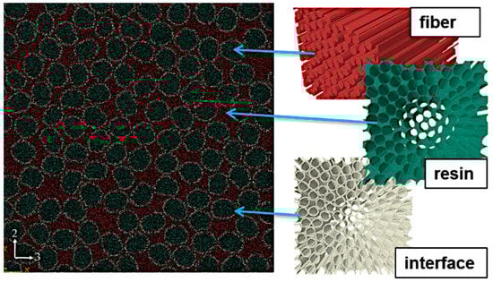 An image-based approach is used to obtain a representative microstructure for further micromechanical analysis. SEM images were segmented initially to a two-phase depiction of the material, the fiber and resin phases, respectively. In order to improve the realism of modelling and eliminate possible artefacts from SEM specimen preparation, individual fibers were detached algorithmically. These two-dimensional segmented images were extruded to yield a cubic representative volume element (RVE) of the composite. As image-based meshing was utilized; no geometric representative of the microstructure was generated at any point, but rather, the segmented data is meshed directly. In addition to the fiber and resin phases, an interface region is included (interphase) (Figure 2). The strategy chosen in the current work is to include the interface firstly to obtain separation of individual fibers and secondly to yield a better description of the composite microstructure and interaction between the fibers and the resin [43,44]. The approach falls within effective interface approaches, i.e., the interface is a third phase, which effectively captures the interface region behaviour between fibers and resin by employing its own mechanical material properties. Further details of the modelling toolset utilized in creating the interphase are presented in [31].